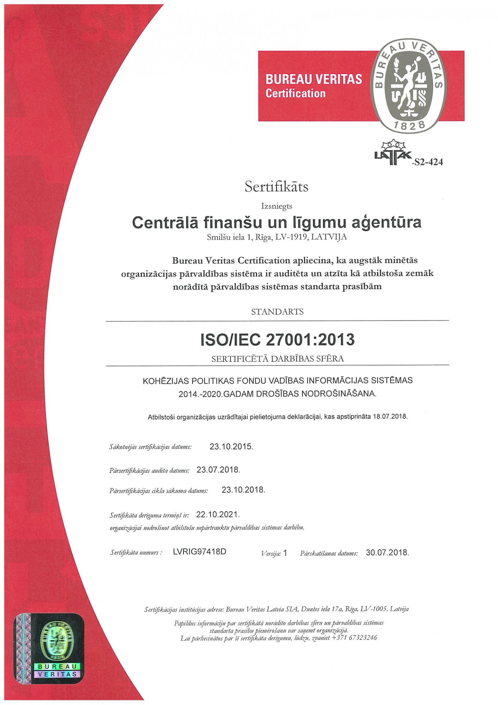 CFLA sertificē Kohēzijas politikas fondu vadības informācijas sistēmu atbilstoši ISO 27001:2013 - informācijas drošības pārvaldības standarta - prasībām |